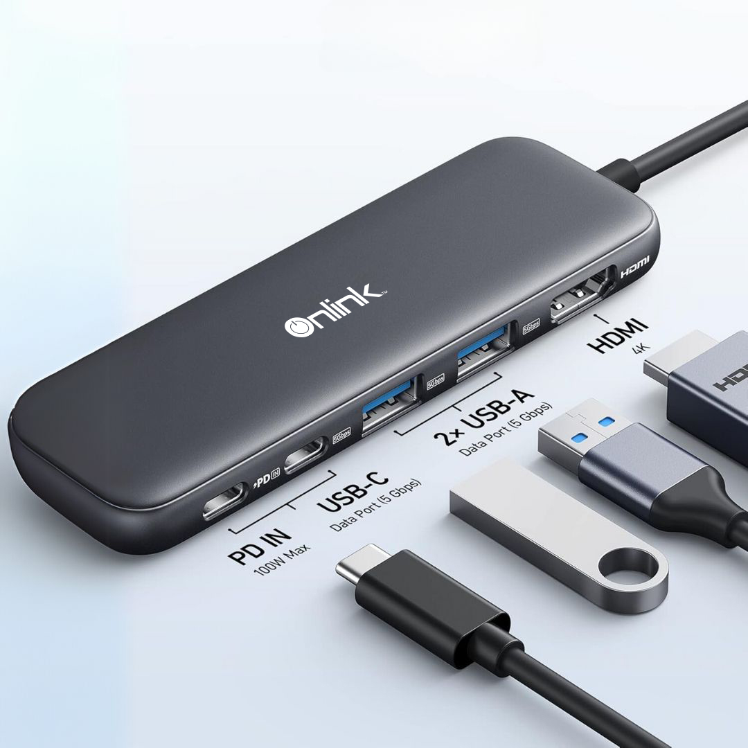Expand your laptop’s connectivity in one sleek solution with the Onlink 5-in-1 USB-C Hub. Designed for modern professionals, this compact hub offers powerful performance and versatility—featuring a 4K HDMI output, one USB-C (5Gbps), and two USB-A 3.0 ports (5Gbps), all in one streamlined device.