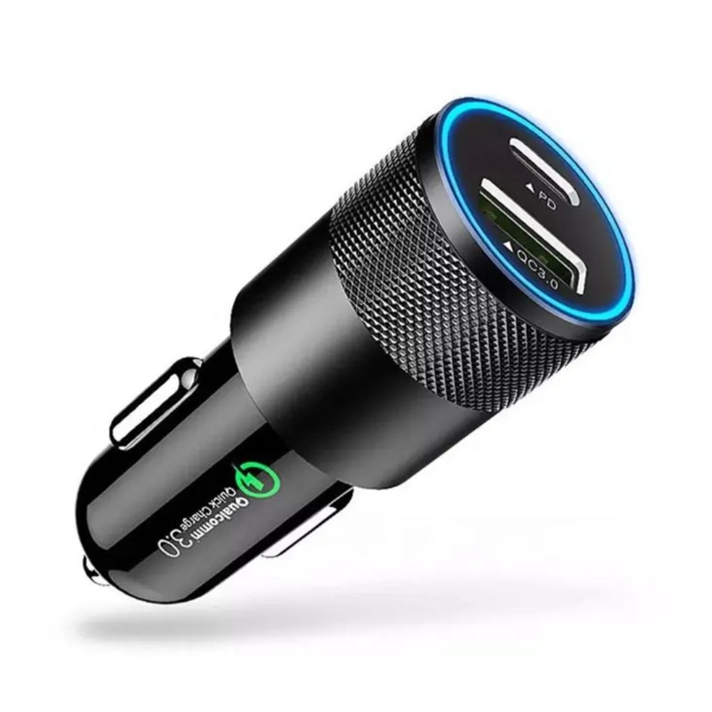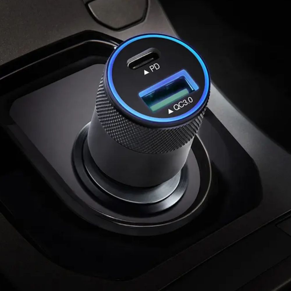 Dual-port car charger with Quick Charge and Power Delivery (PD) support. Fast, safe, and universally compatible—perfect for charging on the road.
