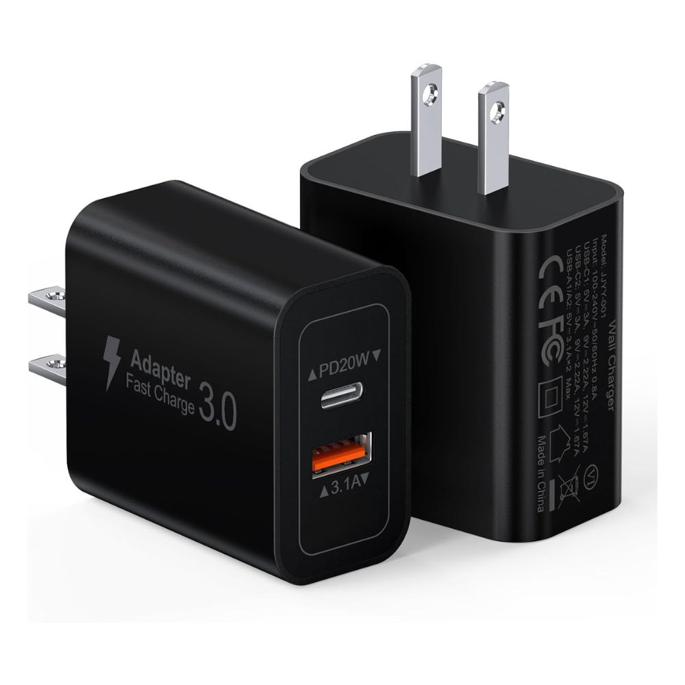 Fast-charging dual USB-C wall charger with Power Delivery. Compact and powerful, ideal for iPhone, Samsung Galaxy, OnePlus, Xiaomi, and more.